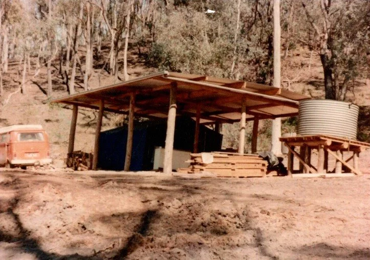 The Hut started off as a flat area used as a camp ground. My parents grew tired of putting up and packing away the large heavy canvas tents of that era and had a bush pole frame and corrugated iron roof constructed by our former neighbour Freddy Porter with bush poles sourced from the property. The tent and camp equipment remained set up here until the tent perished.